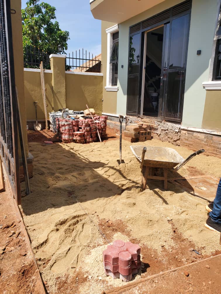 This image shows the installation phase of a high-quality interlocking paving project by Mutembeyi Construction. After p