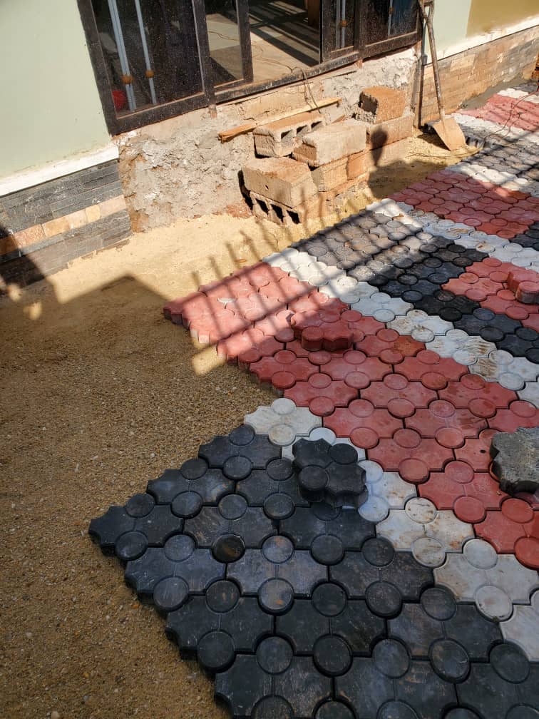 This image shows the installation phase of a high-quality interlocking paving project by Mutembeyi Construction. After p